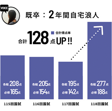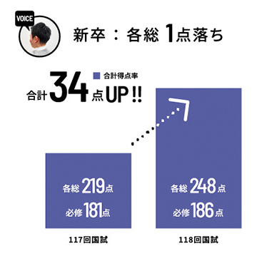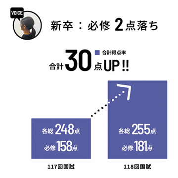 入会前は少し不安でしたが、基礎から徹底的に時間をかけて学習できるカリ キュラムで、本番は強い心で必修も戦えました。