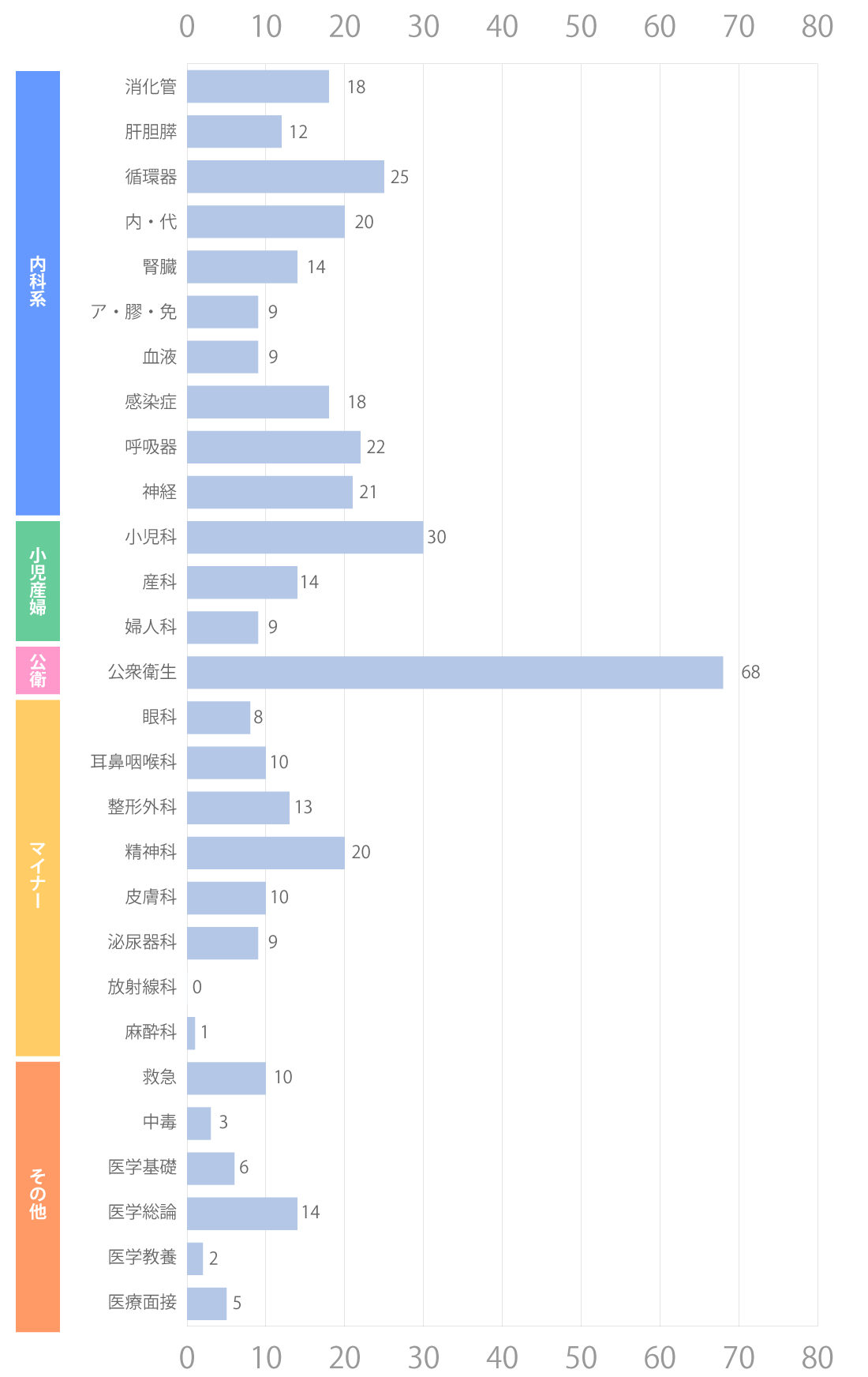 ちなみに、119回医師国家試験では、次に出題が多い科目は、小児科:30問、その次が循環器:25問。この数字からも公衆衛生の出題割合が高いのは一目瞭然です。
