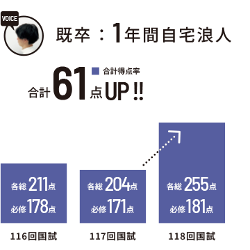 入会前は少し不安でしたが、基礎から徹底的に時間をかけて学習できるカリ キュラムで、本番は強い心で必修も戦えました。