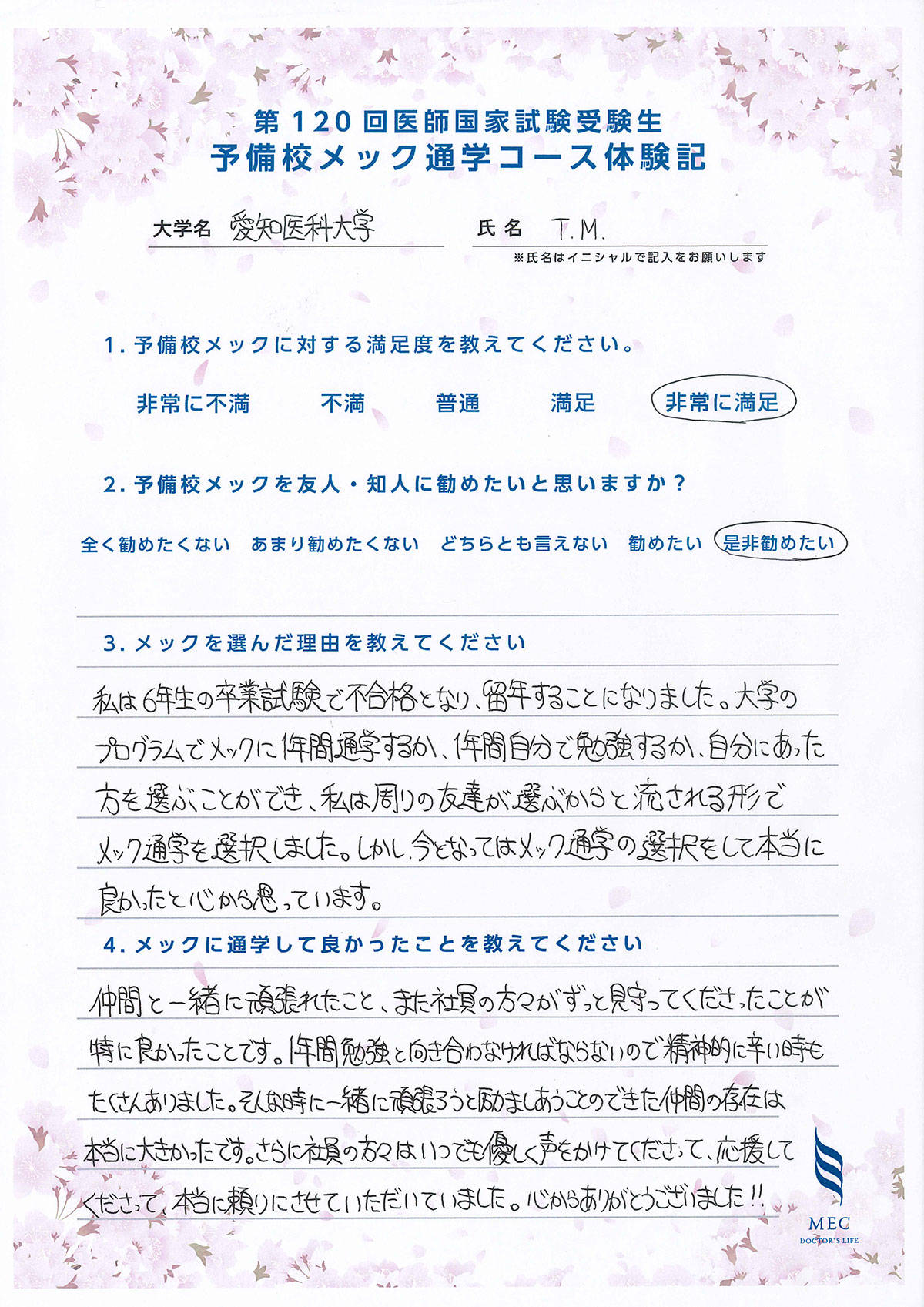 私は6年生の卒業試験で不合格となり、留年することになりました。大学のプログラムでメックに1年間通学するか、1年間自分で勉強するか、自分にあった方を選ぶことができ、私は周りの友達が選ぶからと流される形でメック通学を選択しました。しかし今となってはメック通学の選択をして本当に良かったと心から思っています。