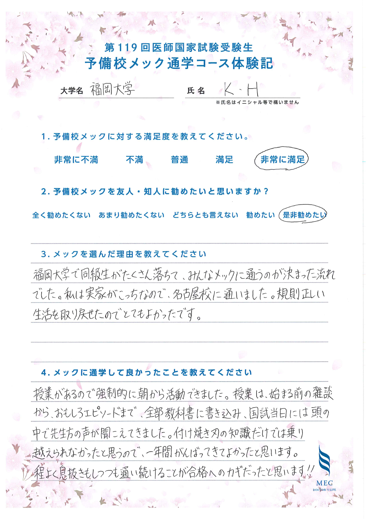 授業があるので強制的に朝から活動できました。授業は、始まる前の雑談から、おもしろエピソードまで、全部教科書に書き込み、国試当日には頭の中で先生方の声が聞こえてきました。付け焼き刃の知識だけでは乗り越えられなかったと思うので、一年間がんばってきてよかったと思います。程よく息抜きもしつつも通い続けることが合格へのカギだったと思います!!