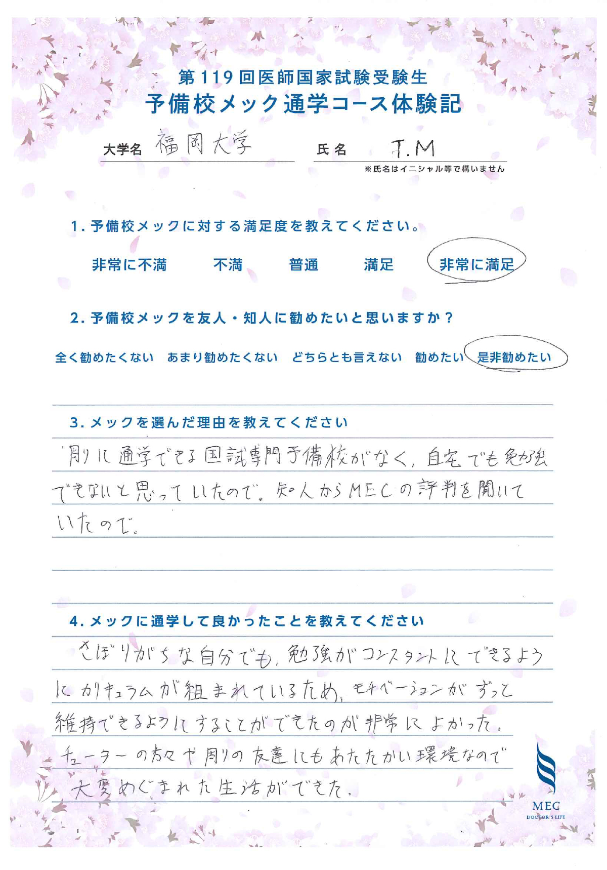周りに通学できる国試専門予備校がなく、自宅でも勉強できないと思っていたので。知人からメックの評判を聞いていたので。