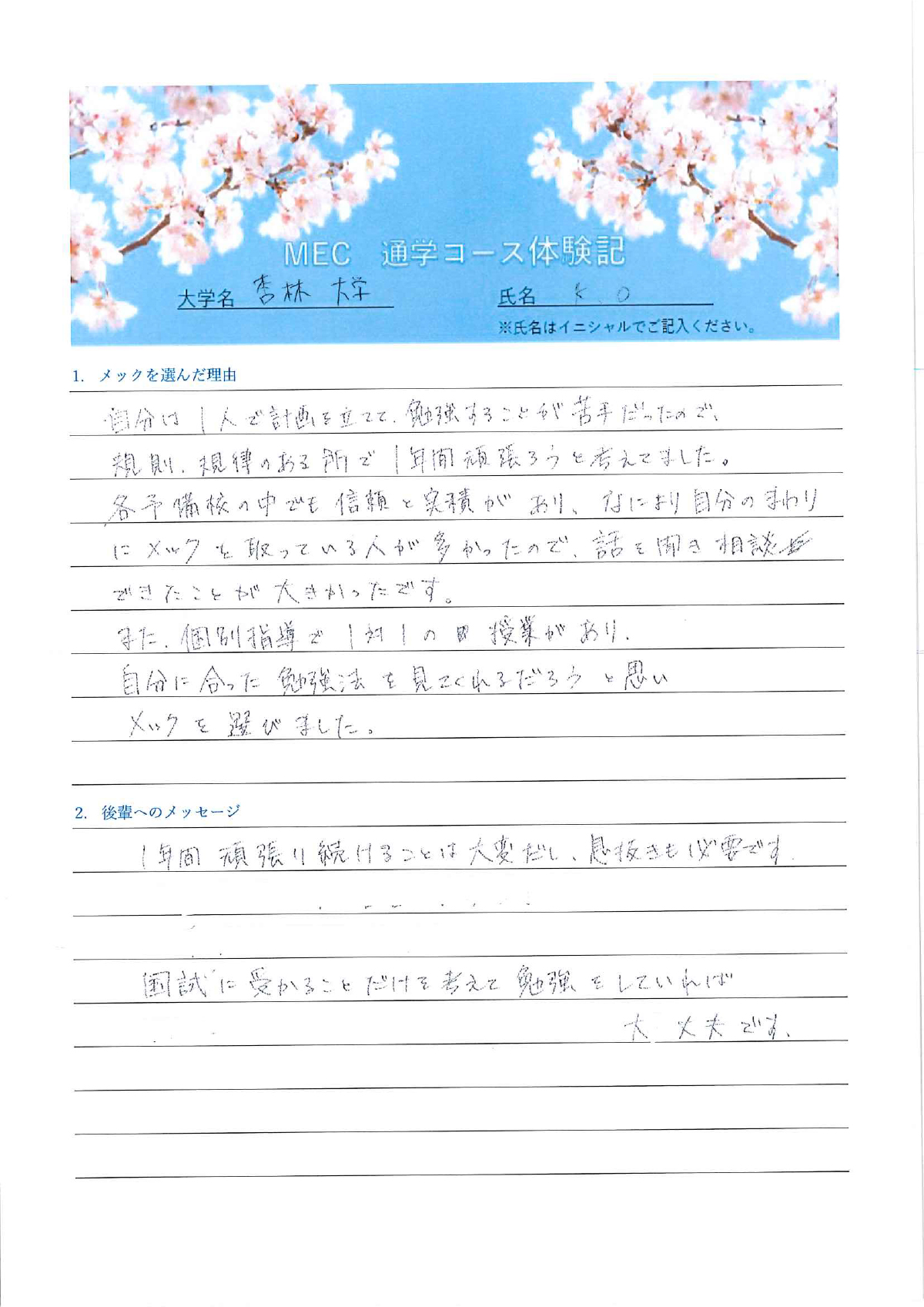 自分は一人で計画を立てて勉強することが苦手だったので、規則、規律のあるところで1年間頑張ろうと考えていました。予備校の中でも信頼と実績があり、何より自分の周りにメックを使っている人が多かったので、話を聞き相談できたことが大きかったです。