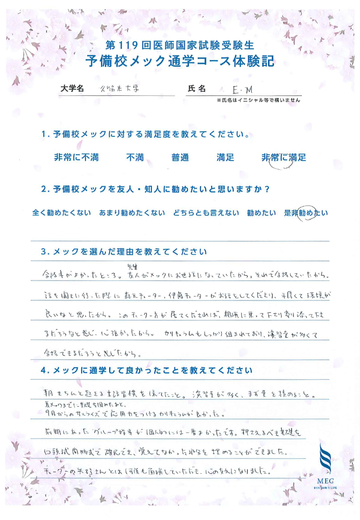 合格率がよかったところ。先輩(友人)がメックにお世話になっていたから。それで合格していたから。話を聞きに行った際に森元チューター、伊藤チューターがお話をしてくださり、手厚くて環境が良いなと思ったから。この方たちが居てくだされば、相談に乗ってくださり寄り添ってくださるだろうなと感じ、心強かったから。カリキュラムもしっかり組まれており、演習量が多くて、合格できるだろうと感じたから。