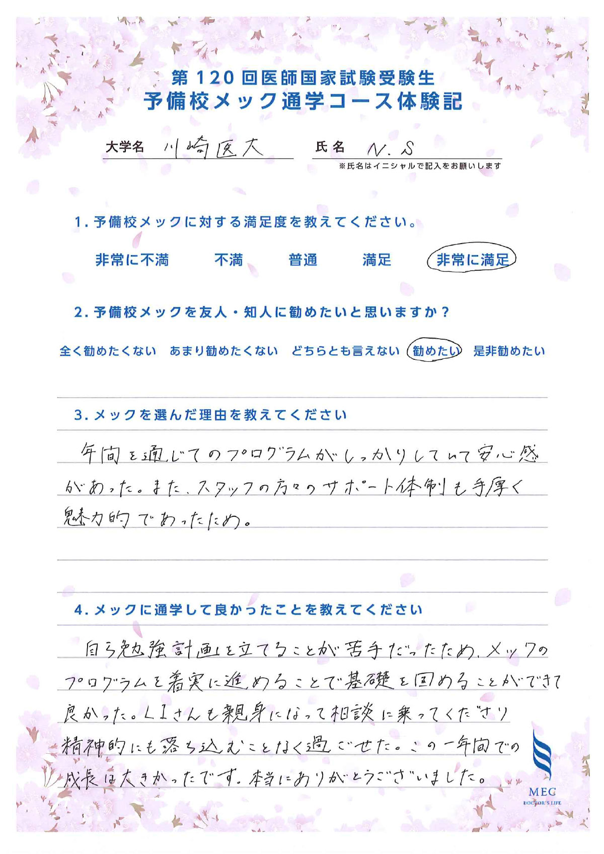 自ら勉強計画を立てることが苦手だったため、メックのプログラムを着実に進めることで基礎を固めることができて良かった。LIさんも親身になって相談に乗ってくださり精神的にも落ち込むことなく過ごせた。この一年間での成長は大きかったです。本当にありがとうございました。