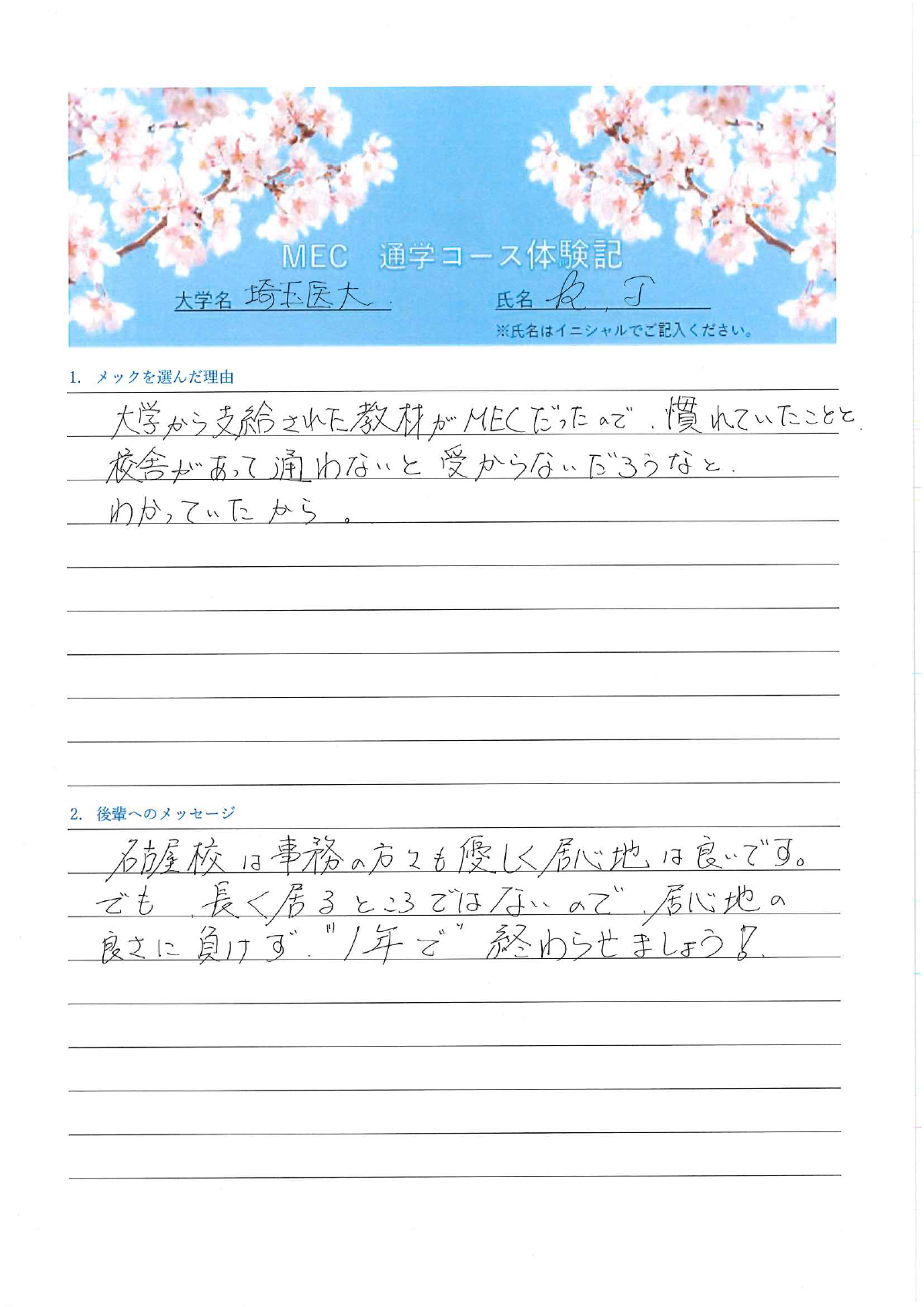 大学から支給された教材がMECだったので、慣れていたことと、校舎があるところに通わないと受からないだろうなとわかっていたから。