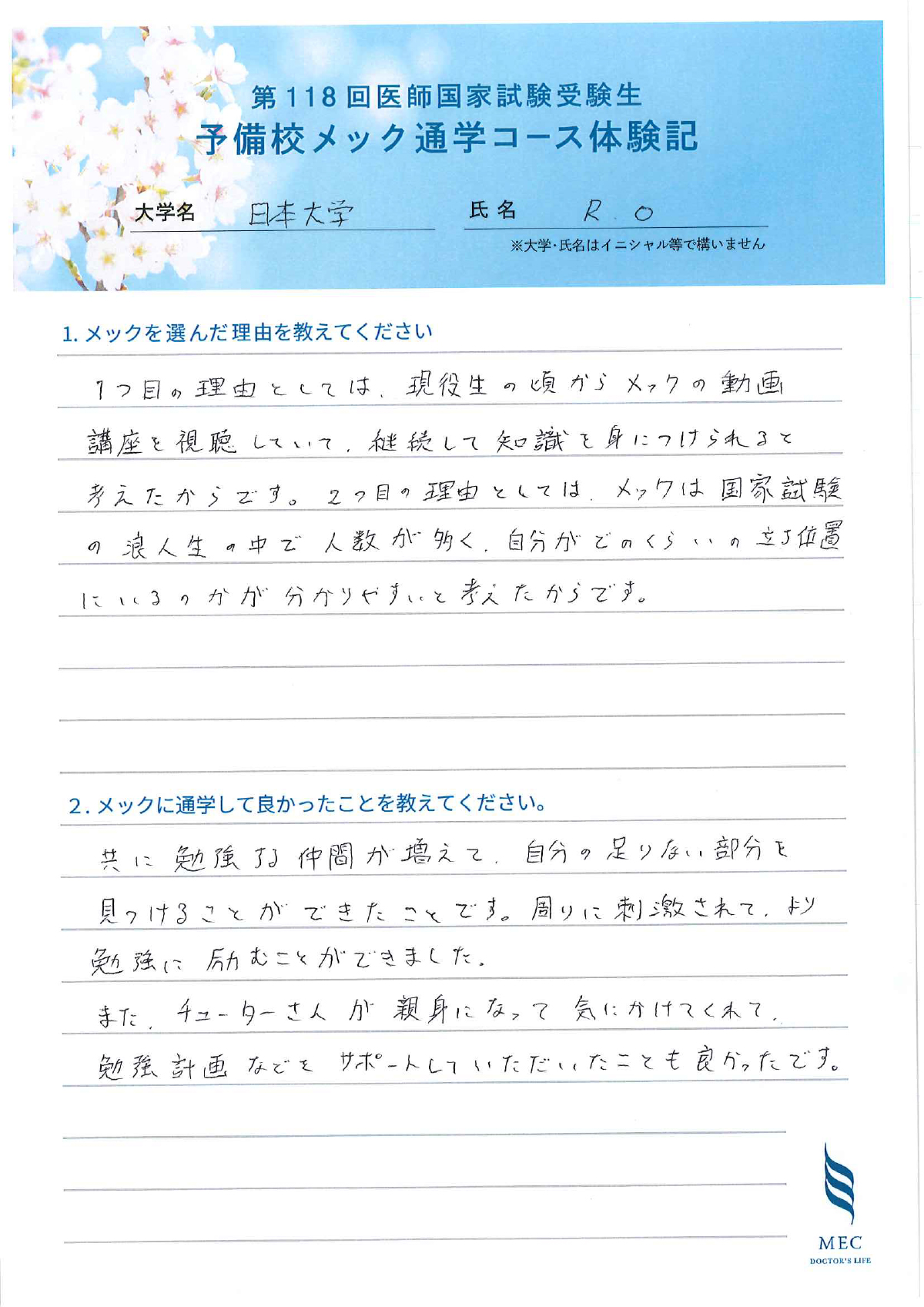 2つ目の理由としては、メックは国家試験の浪人生の中で人数が多く、自分がどのくらいの立ち位置にいるのかが分かりやすいと考えたからです。