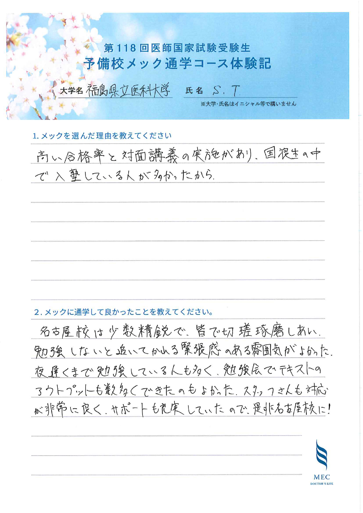 名古屋校は少数精鋭で、皆で切磋琢磨しあい、勉強しないとおいていかれる緊張感のある雰囲気が良かった。