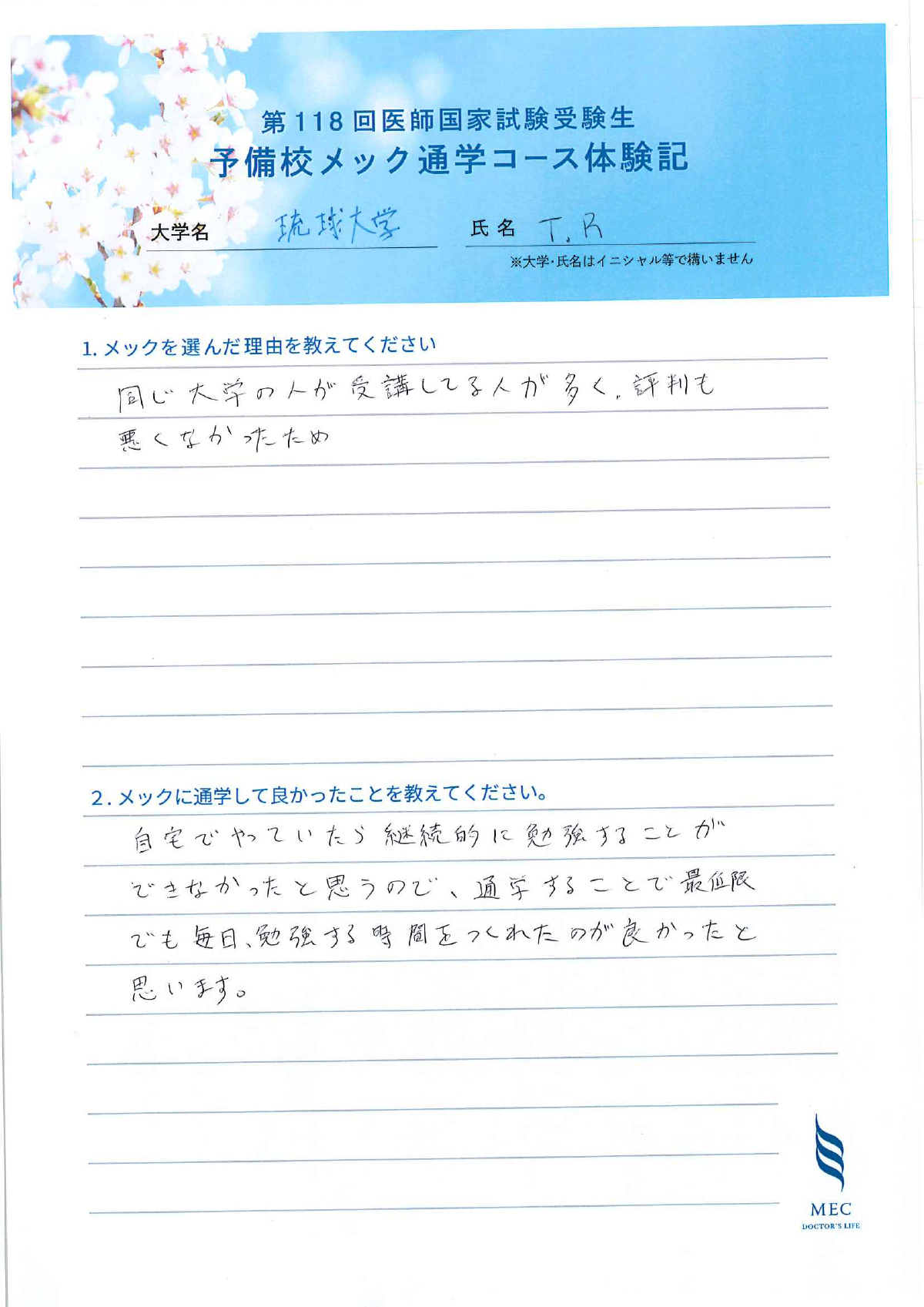 自宅でやっていたら継続的に勉強することができなかったと思うので、通学することで最低限でも毎日、勉強する時間をつくれたのが良かったと思います。