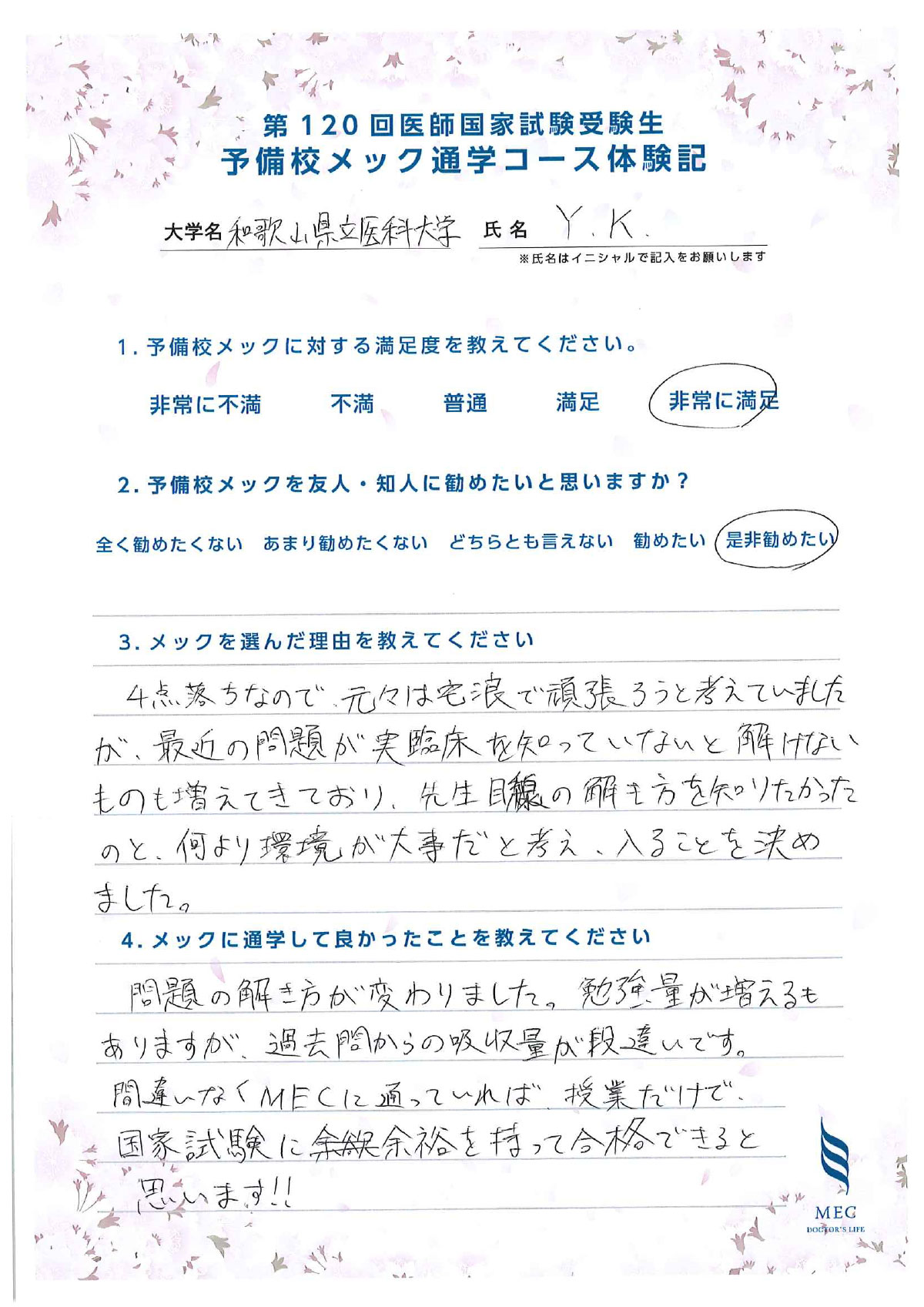 問題の解き方が変わりました。勉強量が増えるのもありますが、過去問からの吸収量が段違いです。間違いなくMECに通っていれば、授業だけで、国家試験に余裕を持って合格できると思います!!